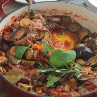 Un plat typique de la cuisine méditerranéenne! Des légumes (aubergines, courgettes, poivrons, oignons et tomates), de l’ail, des herbes aromatiques et une bonne huile d’olive.